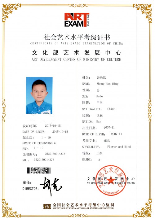 全国美术考级证书 张浩铭 花鸟 3级 0520150014373